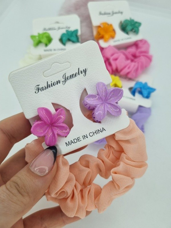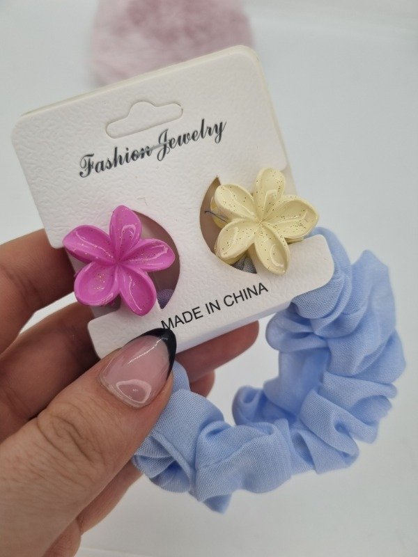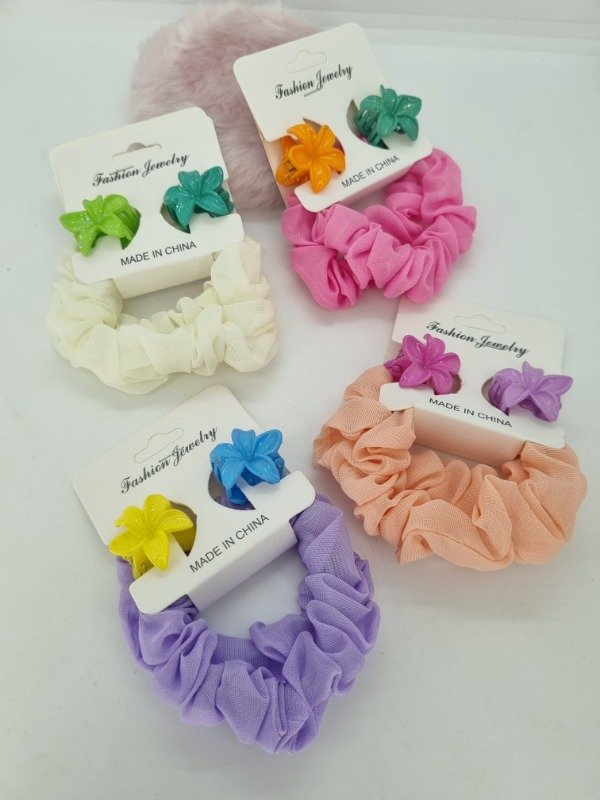 Set colitas scrunchies x2 + 2 broche hawai color
