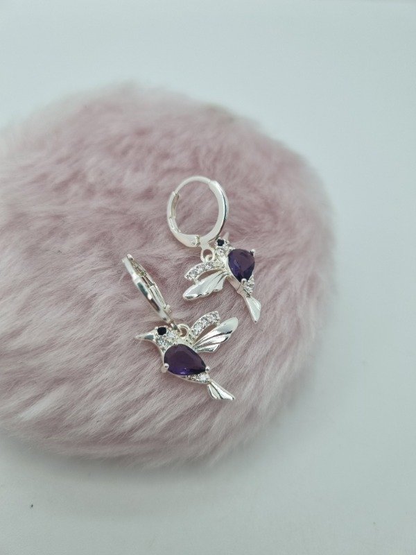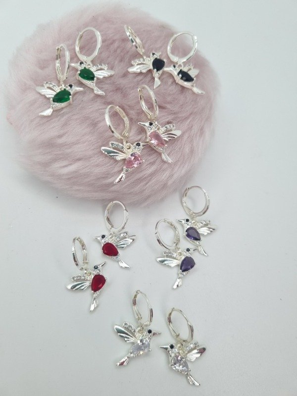 Aros acero blanco argollita fina plana colgante colibrí gema color strass