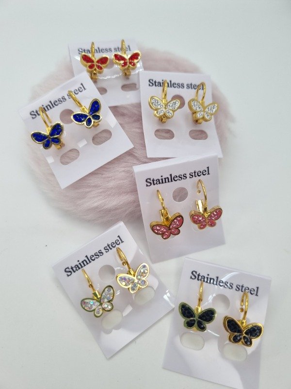 Aros acero dorado argollita colgante aplique mariposa strass color m2