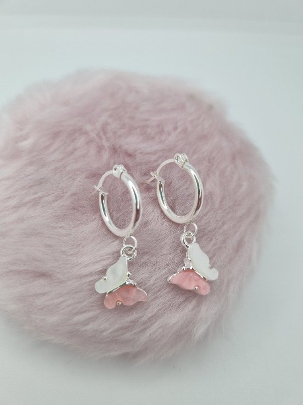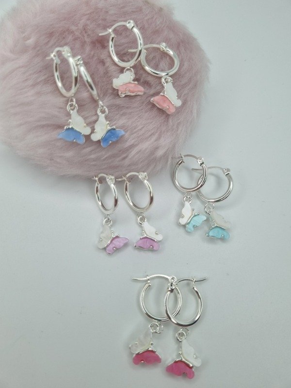 Aros acero blanco argollita colgante mariposa nacar duo mini