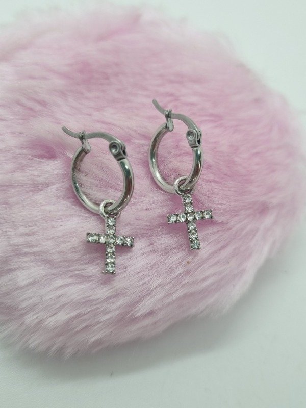 Aros acero quirurgico argollita colgante cruz strass