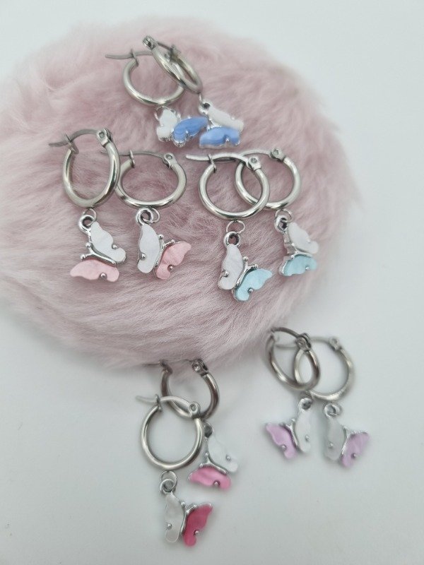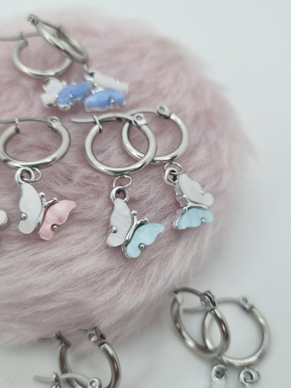 Aros acero quirurgico argollita colgante mariposa nacar duo mini