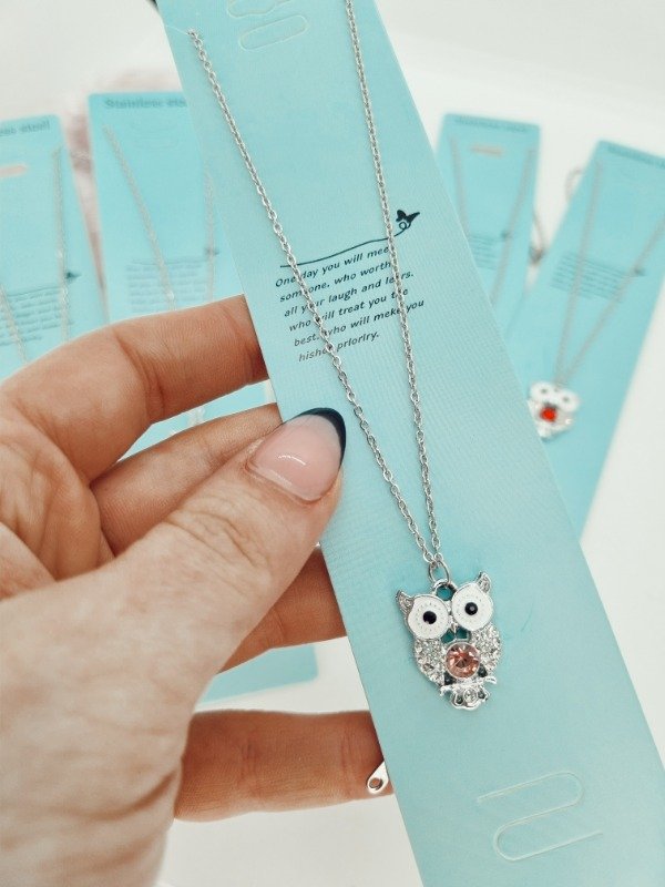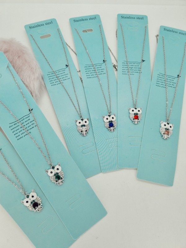 Cadena acero quirurgico dije buho strass gema encartonada