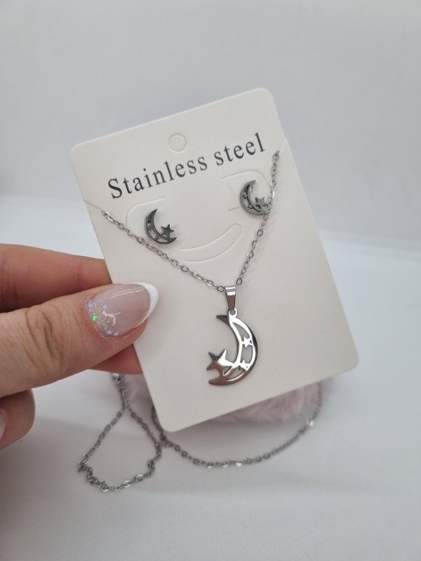 Set acero quirurgico cadena + aritos luna estrella calada