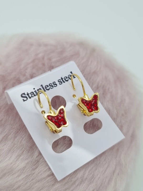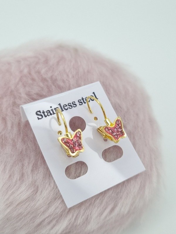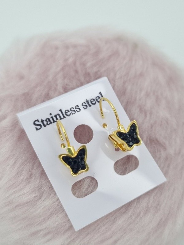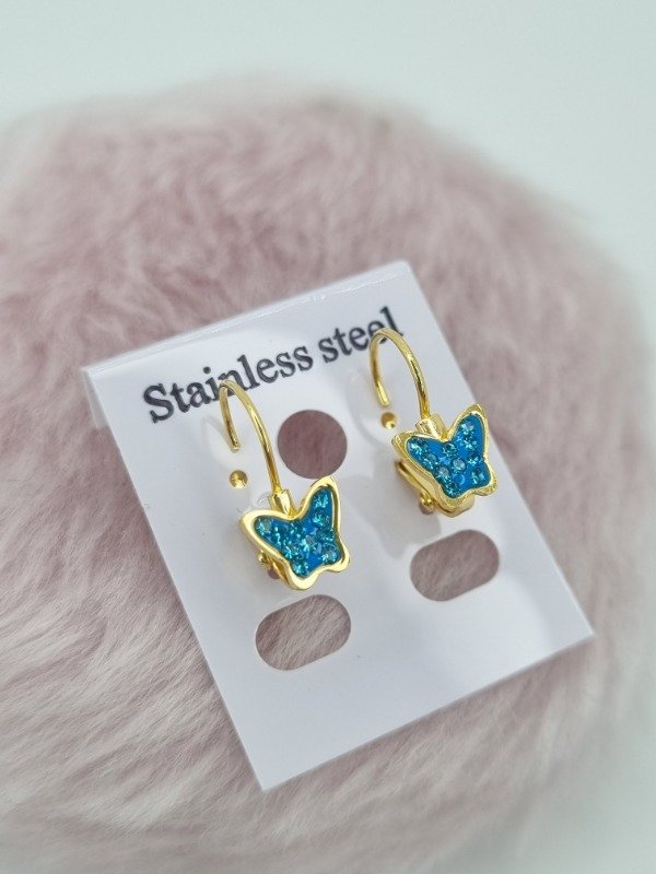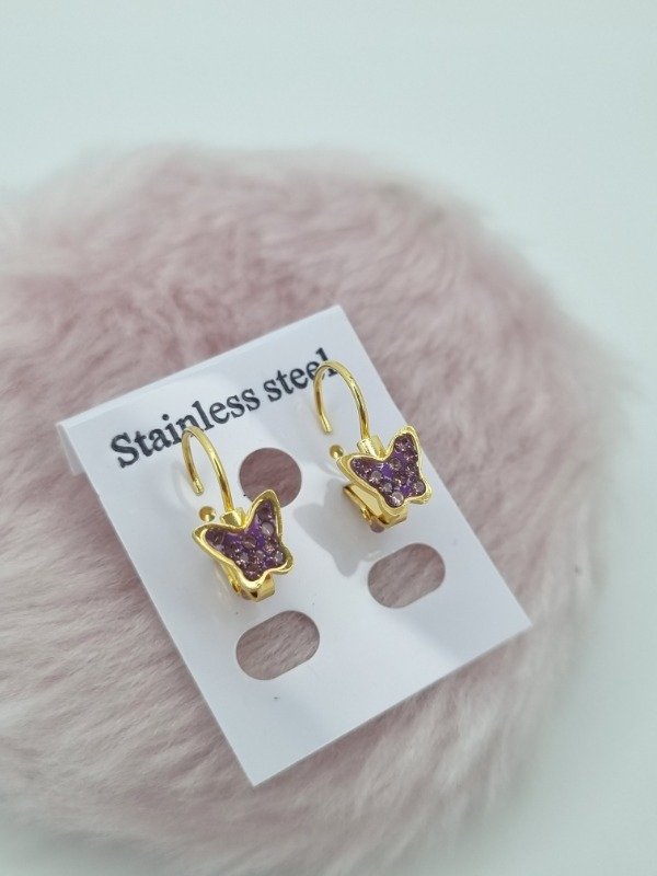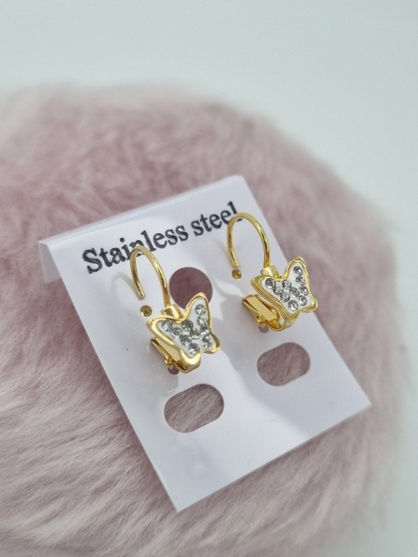 Aros acero dorado argollita colgante aplique mariposa strass color