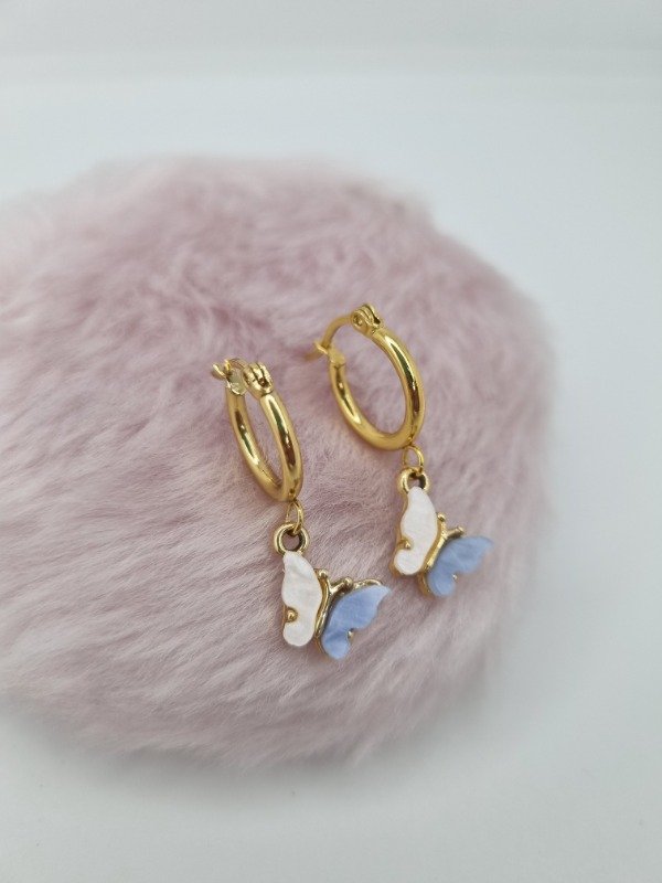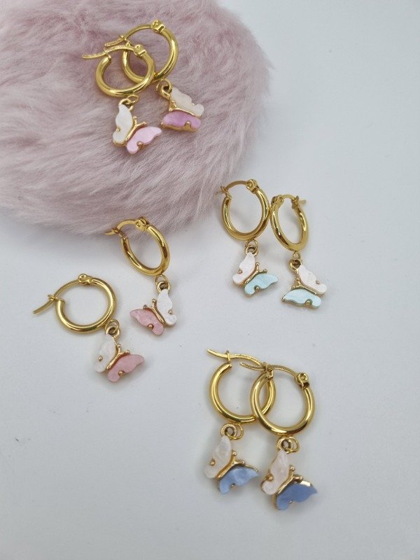 Aros acero dorado argollita colgante mariposa nacar duo mini