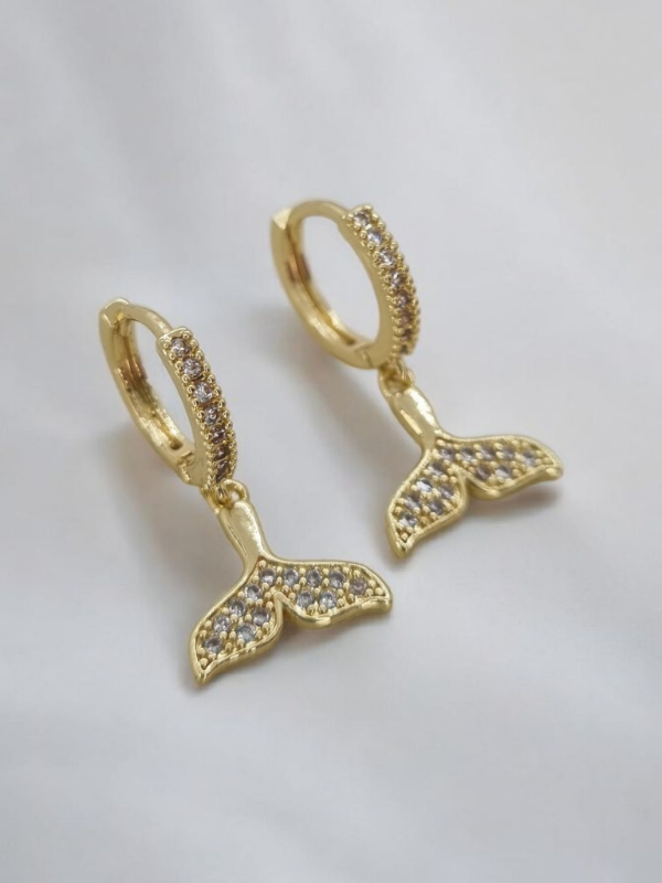 Aros acero dorado argollita strass colgante cola sirena strass